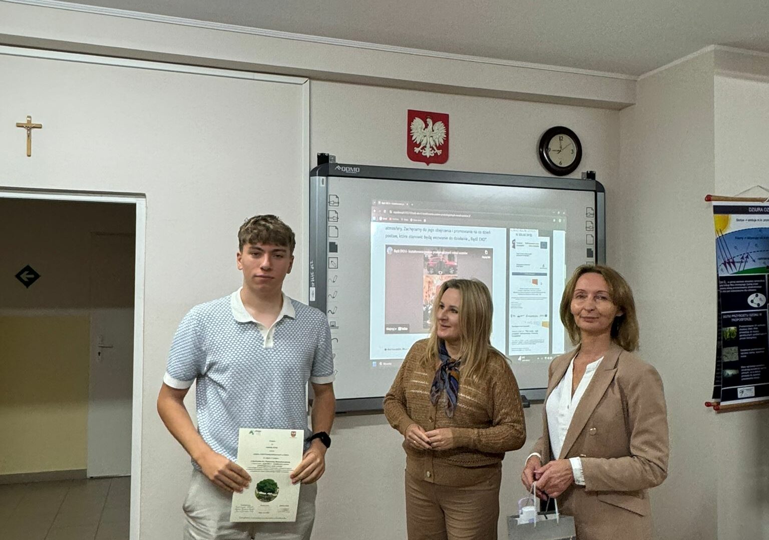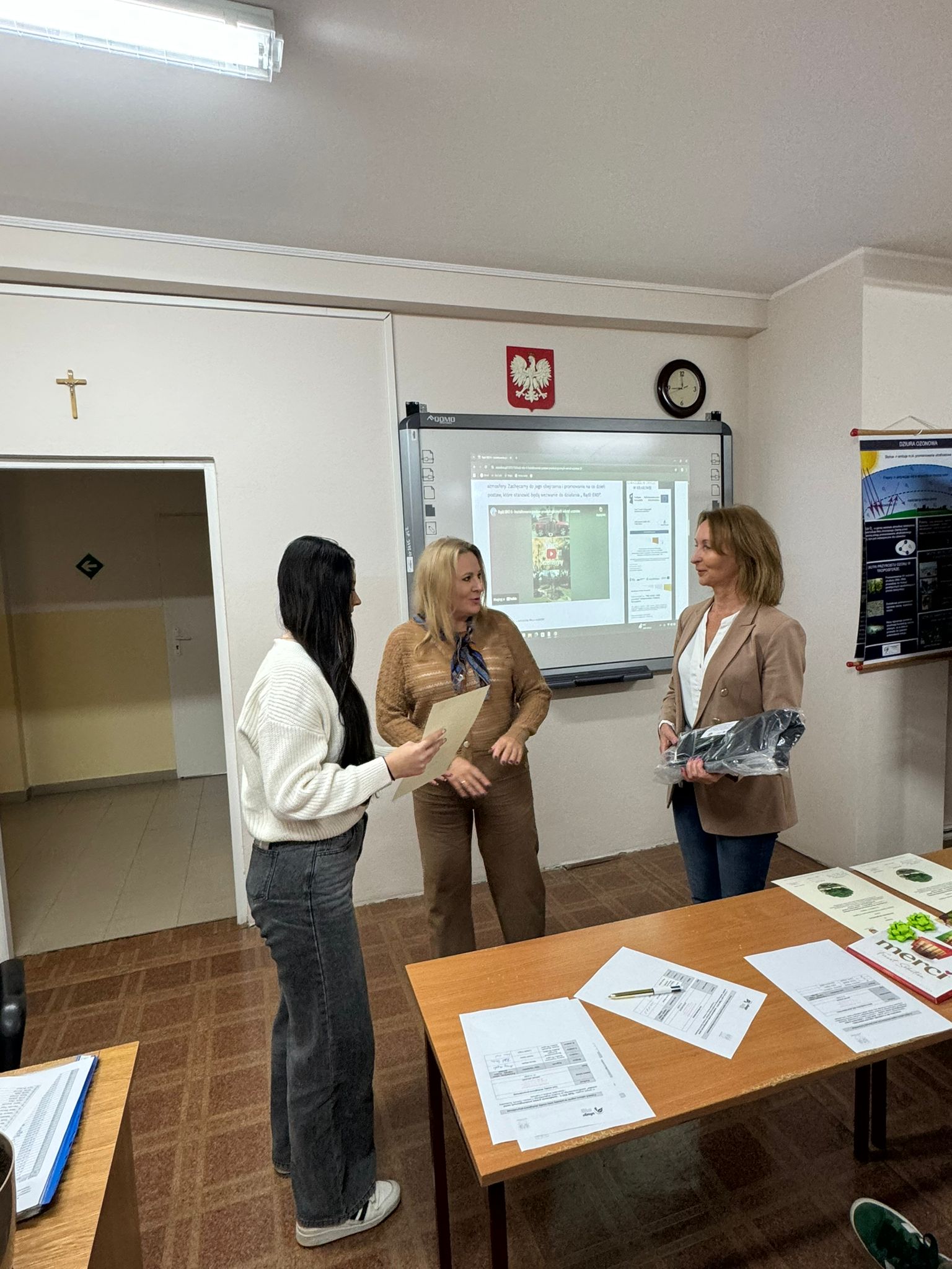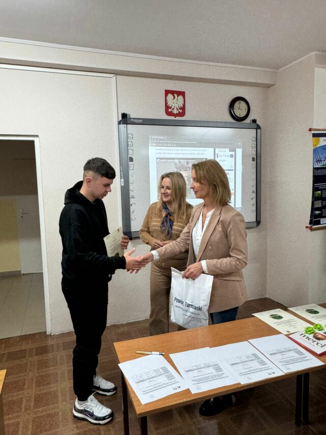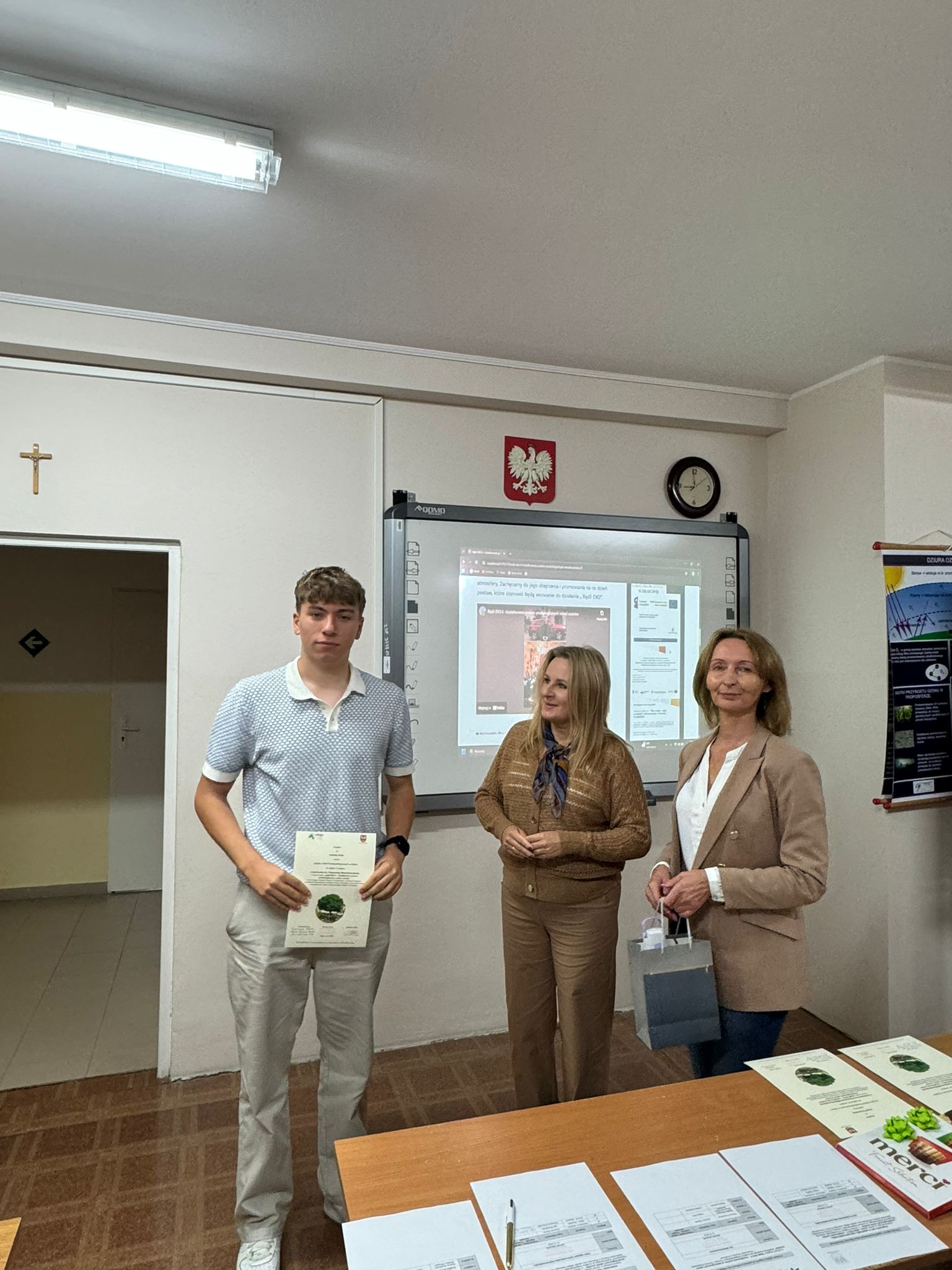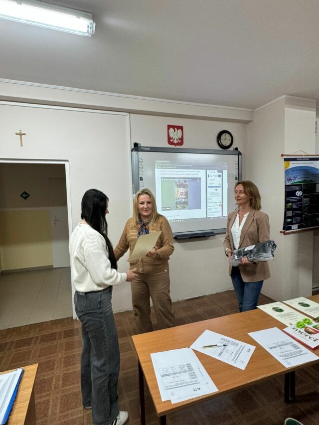 Dnia 10.10.2025 miało miejsce wręczenie nagród w konkursach zorganizowanych w ramach projektu „Bądź EKO 6- kształtowanie postaw proekologicznych wśród uczniów” w ramach programu Priorytetowego „Edukacja Ekologiczna” finansowanego ze środków Wojewódzkiego Funduszu ochrony Środowiska i Gospodarki wodnej w Krakowie przy udziale wkładu własnego Powiatu Tarnowskiego. Wręczenia nagród dokonała pani wicedyrektor Justyna Kaczówka i pani Katarzyna Żołądź.