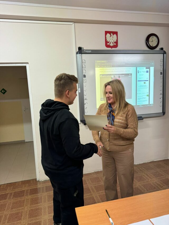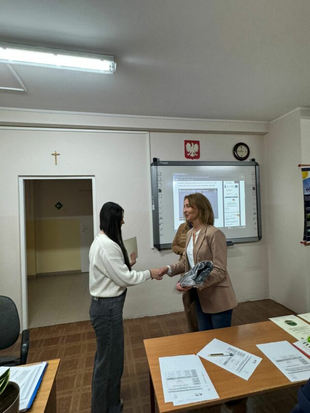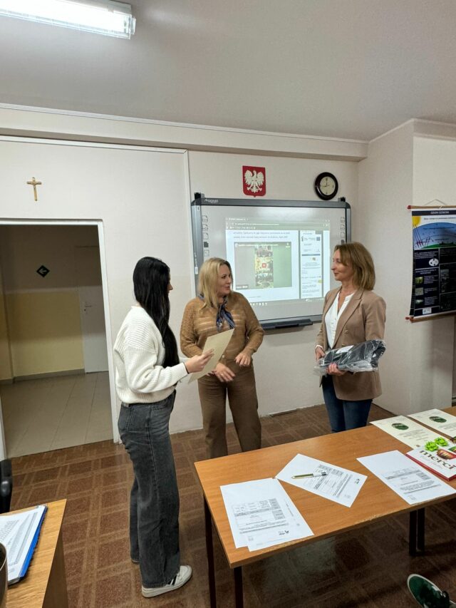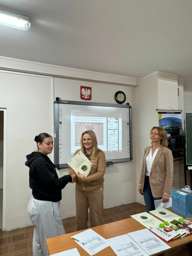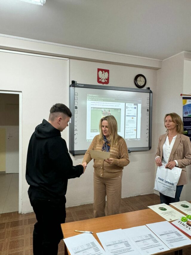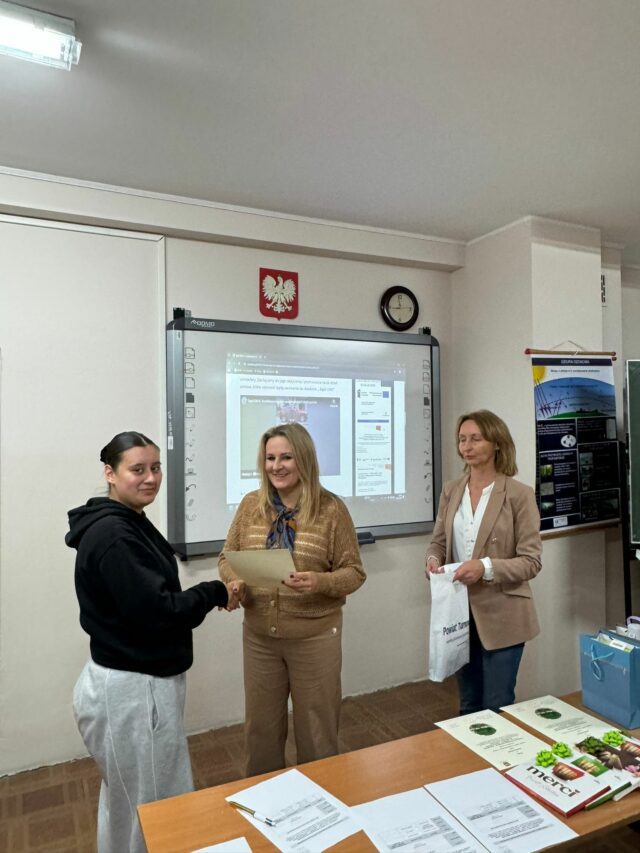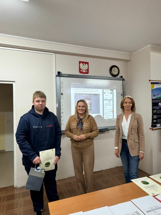 Dnia 10.10.2025 miało miejsce wręczenie nagród w konkursach zorganizowanych w ramach projektu „Bądź EKO 6- kształtowanie postaw proekologicznych wśród uczniów” w ramach programu Priorytetowego „Edukacja Ekologiczna” finansowanego ze środków Wojewódzkiego Funduszu ochrony Środowiska i Gospodarki wodnej w Krakowie przy udziale wkładu własnego Powiatu Tarnowskiego. Wręczenia nagród dokonała pani wicedyrektor Justyna Kaczówka i pani Katarzyna Żołądź.