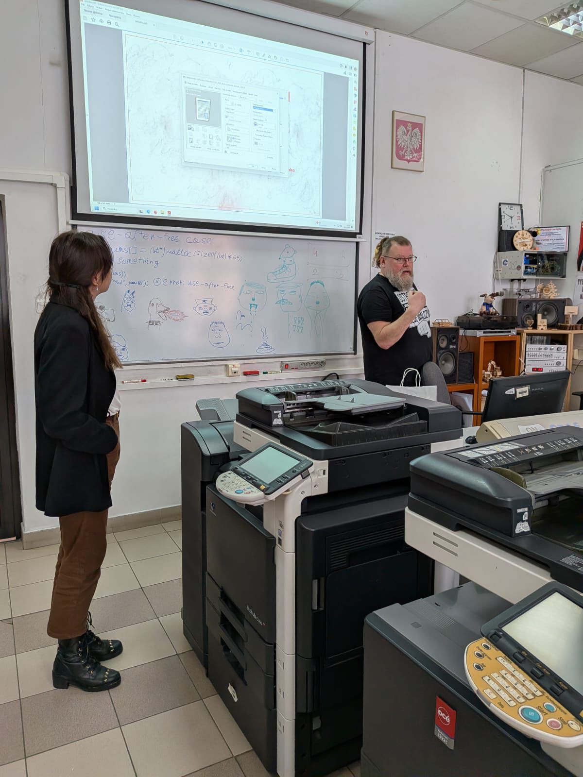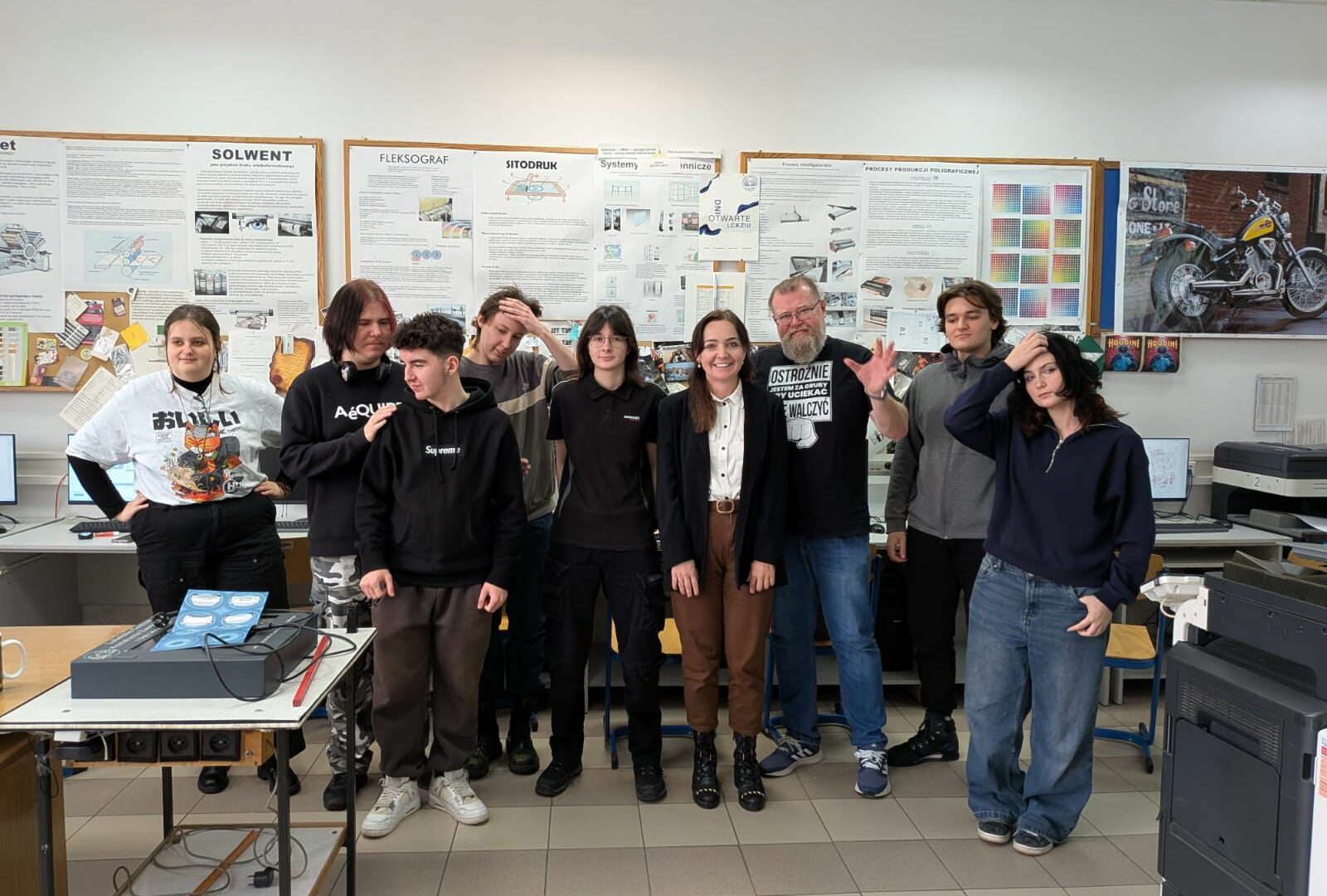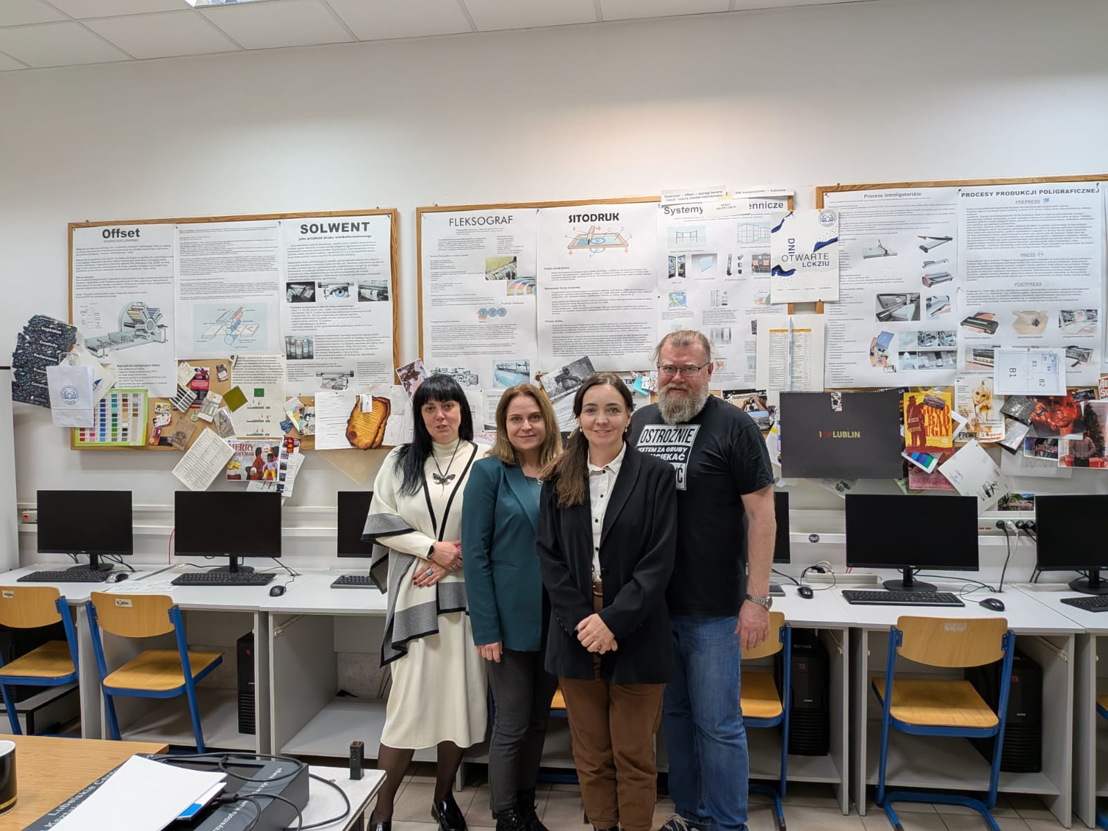 W dniach 25–26 listopada 2024 r. nauczycielki przedmiotów zawodowych z zakresu grafiki i poligrafii – pani Kinga Schab oraz pani Agata Ropek-Nowak – odbyły dwudniową wizytę w Lubelskim Centrum Kształcenia Zawodowego i Ustawicznego im. Krzysztofa Kamila Baczyńskiego. Spotkanie zostało przygotowane bardzo profesjonalnie – gospodarze zadbali zarówno o organizację, jak i o bogaty program merytoryczny. Nasze nauczycielki uczestniczyły w zajęciach prowadzonych przez pana Piotra Kajlewicza, specjalistę w dziedzinie grafiki i poligrafii, co pozwoliło na wymianę doświadczeń dotyczących pracy w pracowniach zawodowych, wykorzystania nowoczesnych narzędzi oraz organizacji egzaminów zawodowych.