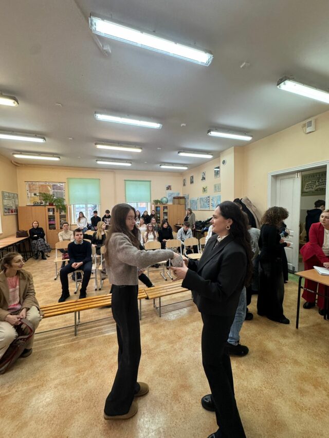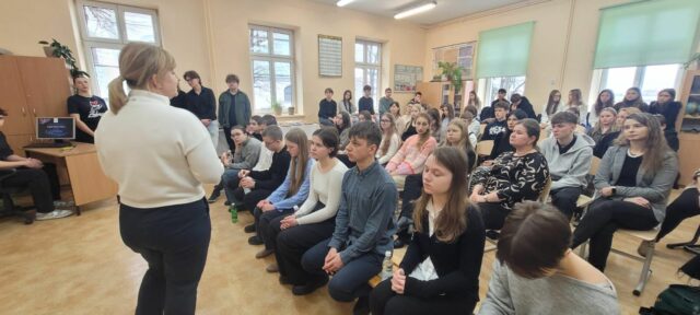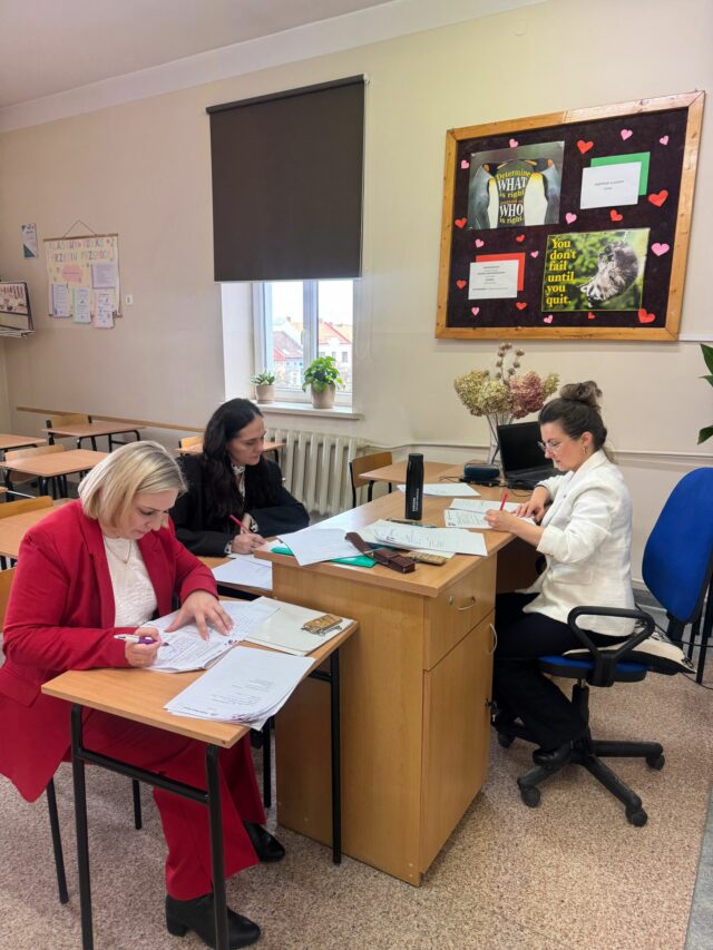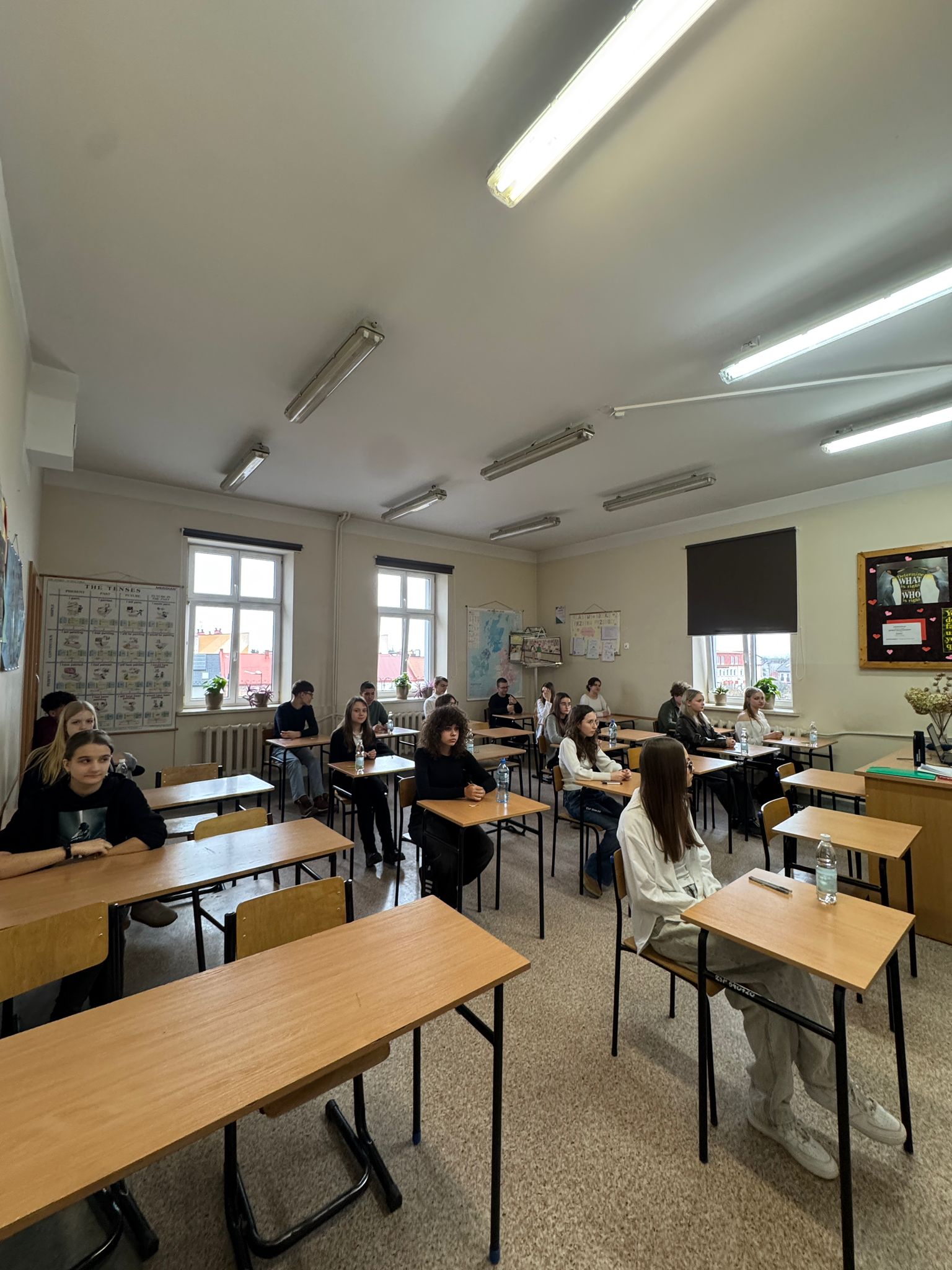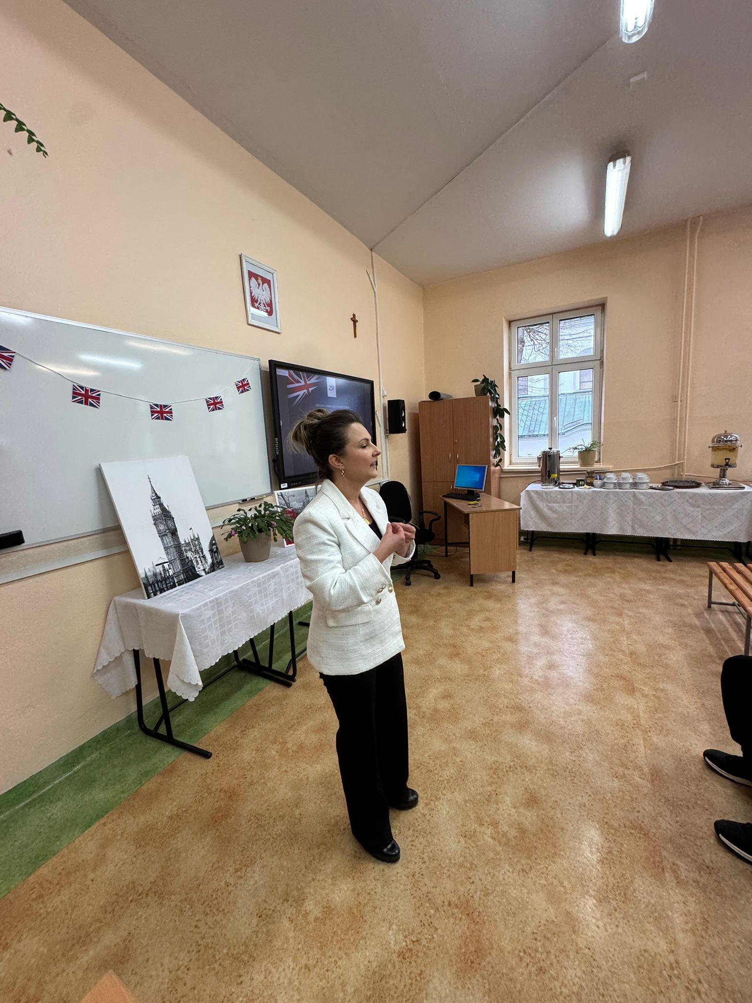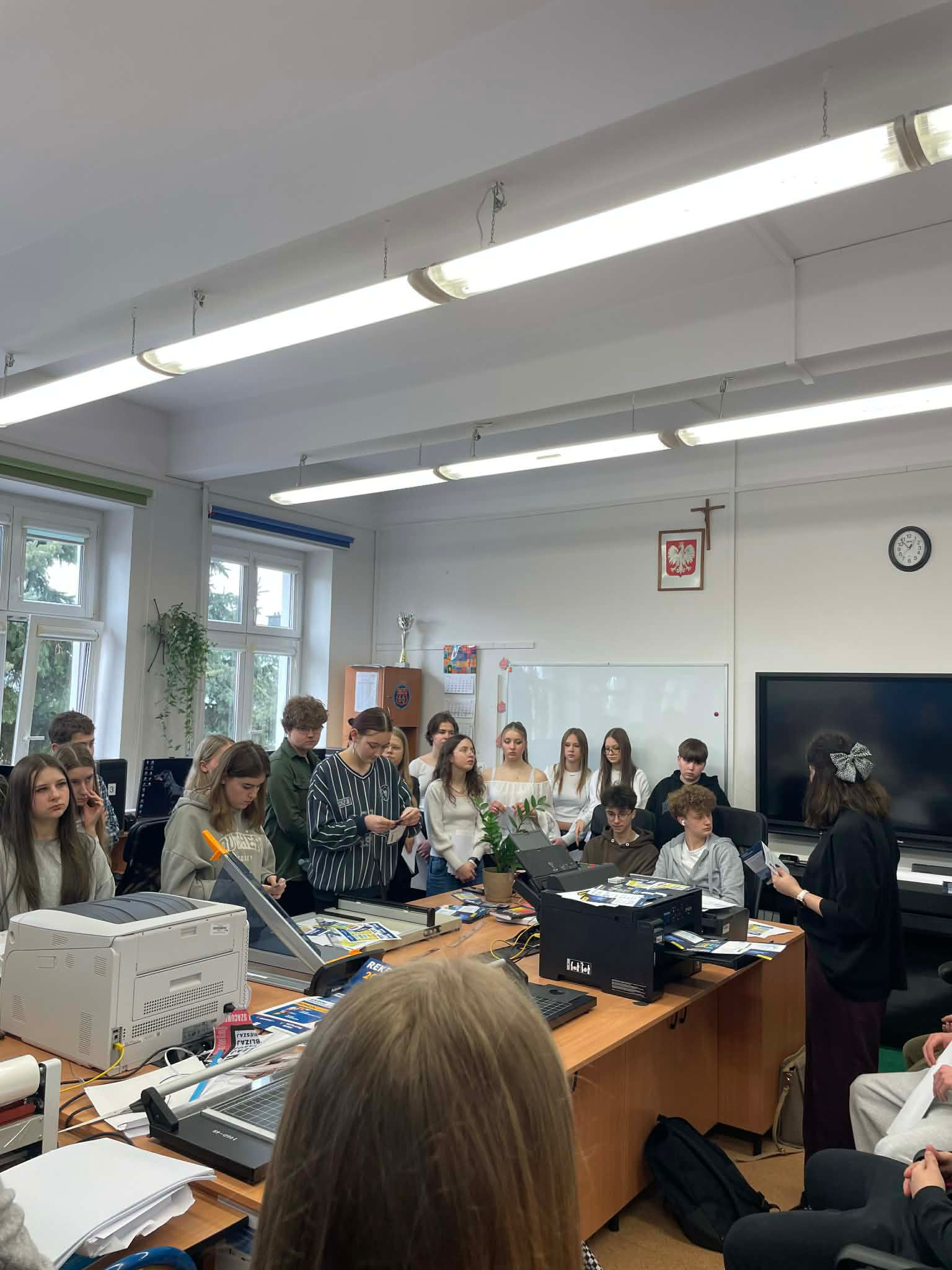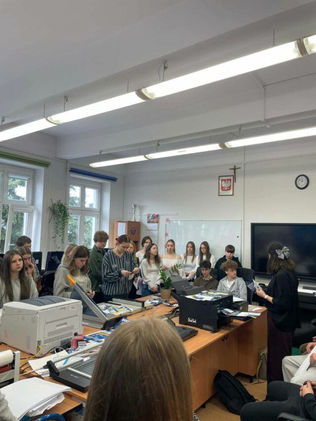 Wydarzenie było również doskonałą okazją do integracji oraz zaprezentowania potencjału naszej placówki. Uczniowie klasy IV TI pełnili rolę gospodarzy, oprowadzając młodszych kolegów po obiekcie szkolnym i przekazując im istotne informacje w języku angielskim. W części oficjalnej przybyłym gościom przedstawiono ofertę edukacyjną szkoły w formie prezentacji multimedialnej, a Pani Urszula Powroźnik przybliżyła zebranym szczegóły dotyczące realizacji programu Erasmus+ w naszej szkole, podkreślając korzyści płynące z międzynarodowej wymiany doświadczeń.