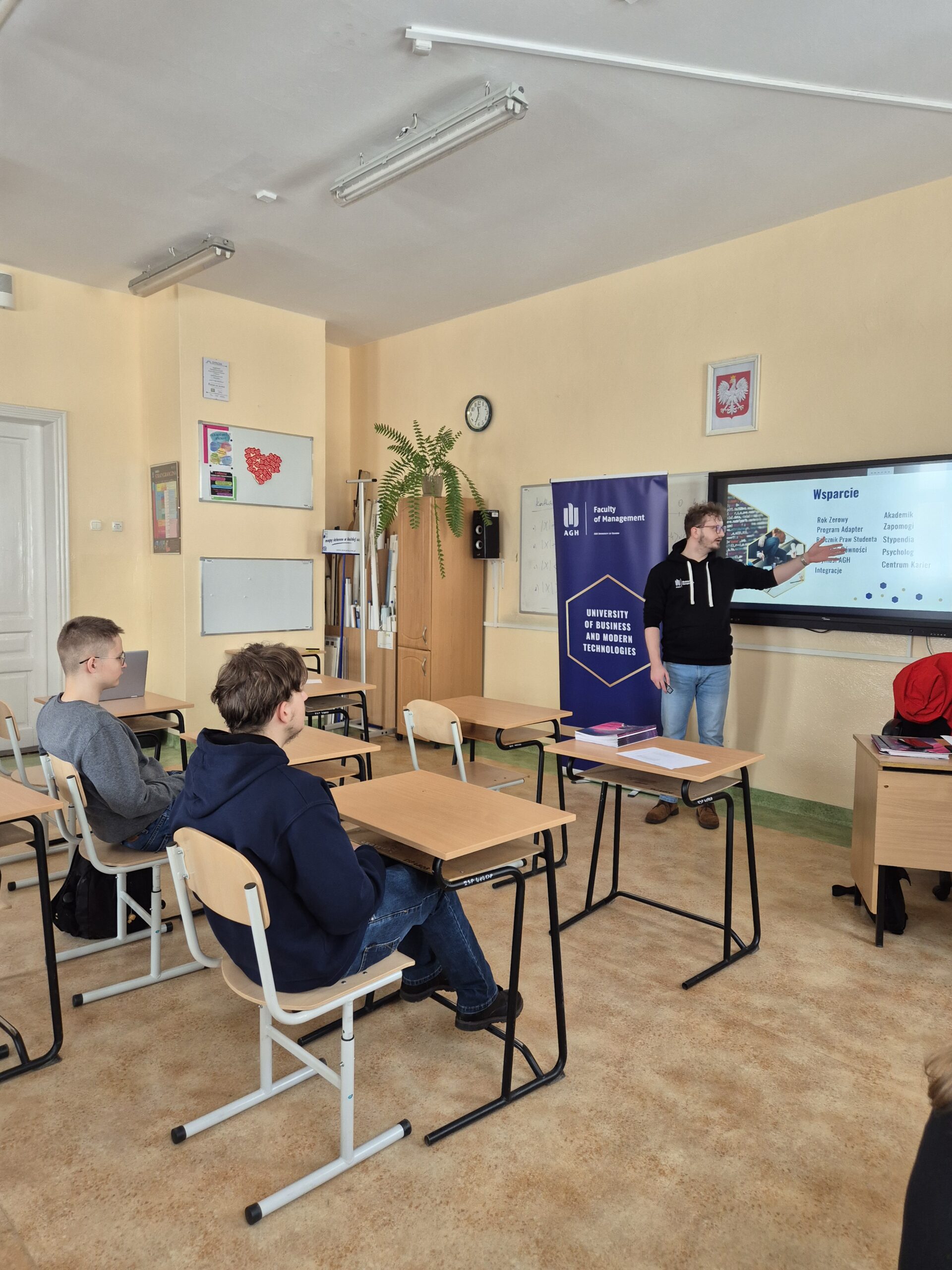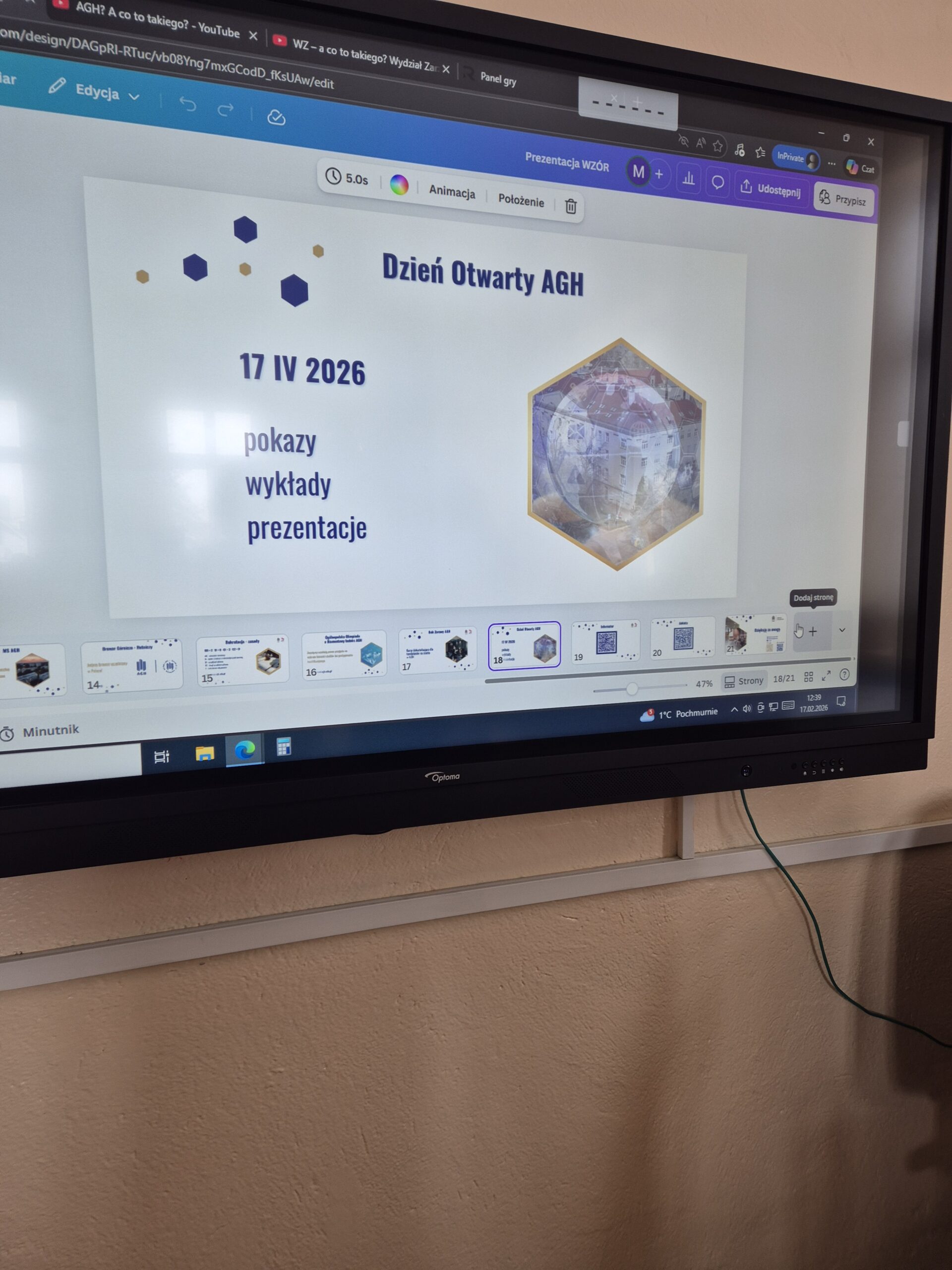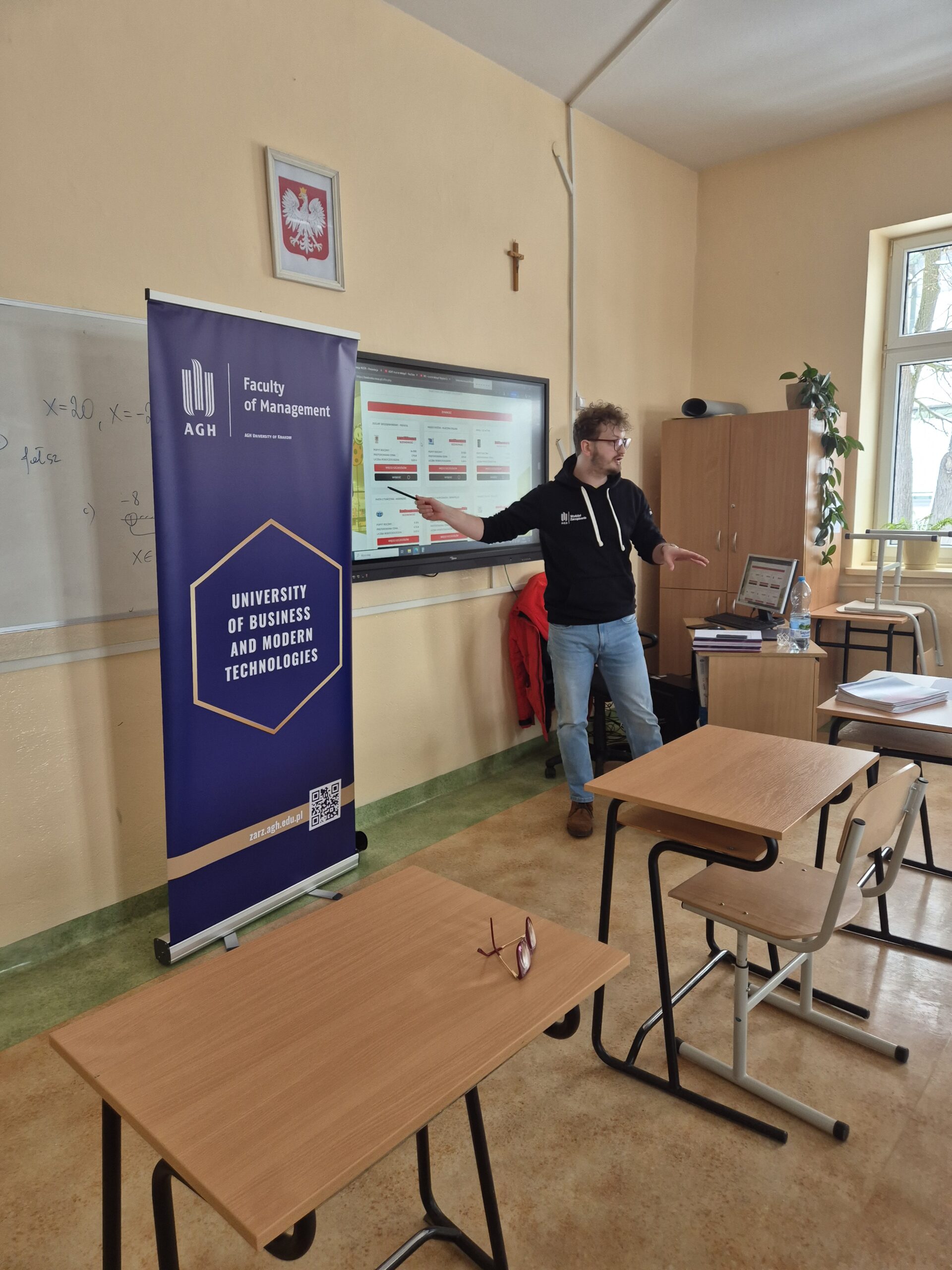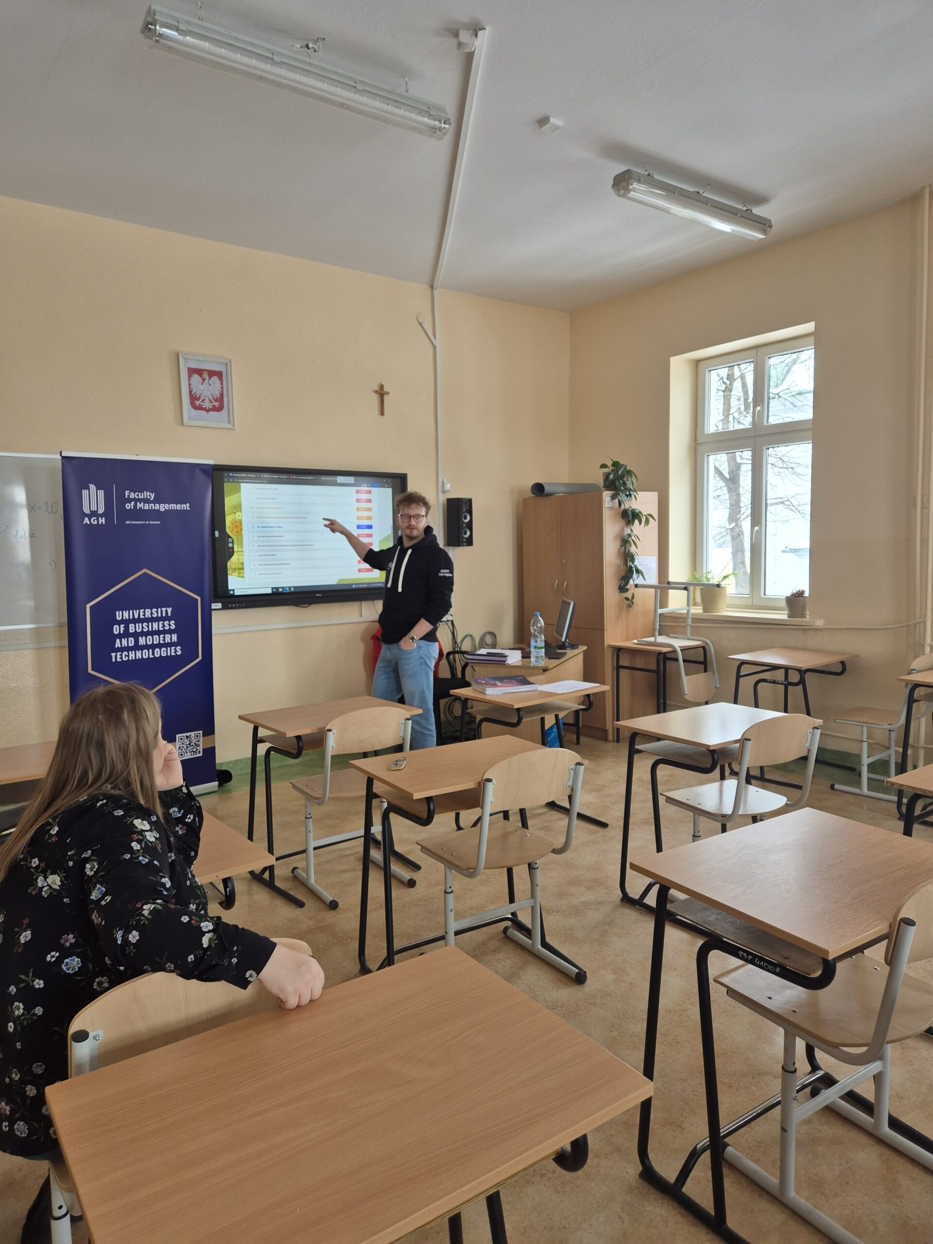 W drugiej części spotkania przedstawiona została oferta kształcenia AGH, kierunki studiów oraz możliwości rozwoju naukowego i zawodowego. Spotkanie było cenną okazją do poszerzenia wiedzy na temat dalszej ścieżki edukacyjnej po ukończeniu szkoły średniej. Zajęcia zostały przeprowadzone w sposób profesjonalny, z dużym zaangażowaniem prowadzącego. Uczniowie aktywnie uczestniczyli w warsztatach, wykazywali duże zainteresowanie tematyką spotkania oraz chętnie zadawali pytania dotyczące studiów i rekrutacji.
