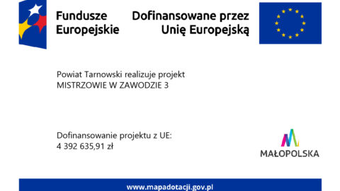 Projekt „Mistrzowie w zawodzie 3” realizowany jest w ramach Programu Fundusze Europejskie dla Małopolski na lata 2021-2027 Priorytet 6 Fundusze europejskie dla rynku pracy, edukacji i włączenia społecznego, Działanie 6.11 Wsparcie kształcenia zawodowego, typ projektu A. Podniesienie jakości kształcenia zawodowego…